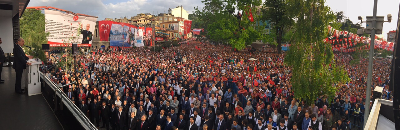 Muhterem Vatandaşlarım, Milliyetçi Hareket, devletle millet kaynaşmasının, milli değerlerimizin ve bin yıllık kardeşliğimizin teminatıdır. Milliyetçi Hareket, Türkiye’nin bölünmesine, değerlerimizin yok edilmesine ve milletimizin kardeş kavgasına sürüklenmesine hiçbir şart altında izin vermeyecektir. Karşımıza çıkacak her engeli tek başımıza aşarız. Yeter ki Trabzon bizimle yürüsün, yeter ki bize destek versin. Aziz kardeşlerim, buradan hepinize soruyorum: Milletimize sahip çıkmaya var mısınız? (Evet) Geleceğinize sahip çıkmaya hazır mısınız? (Evet) Bizimle yürümeye söz veriyor musunuz? (Evet) O halde bunun yolu, tam 11 gün sonra, tertemiz ellerinizle sandıkta üç hilale vuracağınız evet mühründen geçmektedir. Sandık önüne gittiğinizde tarihi bir tercih yapacaksınız. Ve eminim ki; Huzur için, emniyet için, barış için “MHP’ye evet” diyeceksiniz. Şeref için, haysiyet için, kudret için “MHP’ye evet” diyeceksiniz. Birlik için, kardeşlik için, kimlik için “MHP’ye evet” diyeceksiniz. Refah için, aş için, iş için, gelecek için “MHP’ye evet” diyeceksiniz. AKP’ye oy veren kardeşim, ülkemiz kötüye gidiyor. Artık siyasi taassup ve tarafgirlikle hareket edecek vakit kalmamıştır. AKP, aldığı oyları kötüye kullanmış, Türkiye’yi enkaza çevirmiştir. AKP’ye destek veren kardeşim; ülken için, milletin için, vatanın için, geleceğin için bu defa birlikte yürüyelim. Bunlarda hayır yoktur, bunlarda ümit yoktur, bunlarla huzur yoktur. CHP’ye oy veren vatandaşlarım, çağrım sizleredir; bu defa bizimle yürüyün. Kararsız duran, tercihini henüz yapmamış kardeşim; boşuna zaman kaybetme, MHP bil ki seninle, senin yanında. Teröre karşı, bölünmeye karşı, hırsızlara karşı, rüşvetçilere karşı bizimle yürü Trabzon. Refah ve mutluluksa aradığınız; iş ve aşsa istediğiniz bizimle yürüyün. Yürüyüşümüz, korkaklara karşı cesurların yürüyüşüdür. Yürüyüşümüz, ahlaksızlığa karşı namusluların yürüyüşüdür. Yürüyüşümüz Türkiye’nin istiklal ve istikbal yürüyüşüdür. Bizimle yürümeye var mısınız? (Evet) Zalime karşı beraber miyiz? Haine karşı birlikte miyiz? Başkanlık sistemi düşleyen 17-25 Aralık çetesine, PKK’yla yeni Anayasa planlayan zorbalara karşı aynı safta mıyız? (Evet) İşte Trabzon’un cevabı budur. İşte Trabzon’un sedası bu kadar samimi, bu kadar içtendir. Allah hepinizden razı olsun, Allah hepinizi gözetsin, inşallah rahmetiyle bereketlendirsin.