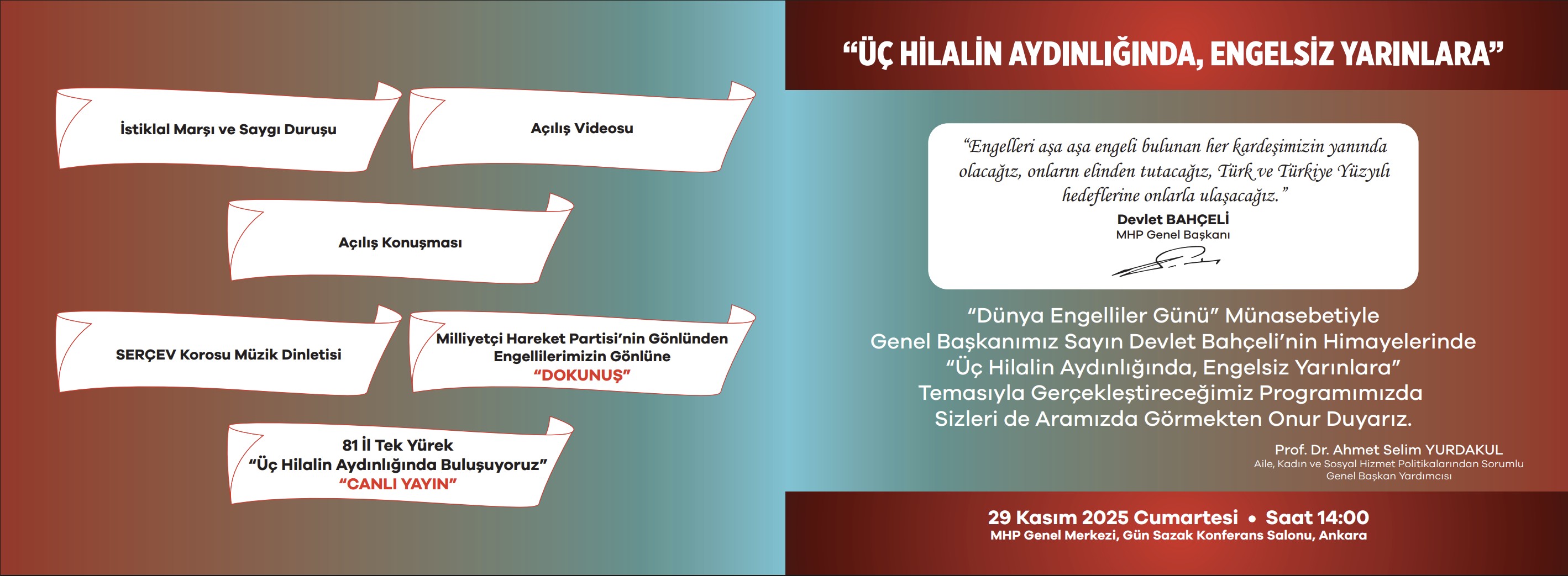Bugün, 3 Aralık Dünya Engelliler Günü vesilesiyle, engelli kardeşlerimizin yüreğindeki umudu ve milletimizin vicdanındaki sesi bir araya getiren, bu anlamlı programda sizlerle birlikte olmaktan büyük bir onur ve mutluluk duyuyorum. Bu duygu ve düşüncelerle, hepinizi en kalbi duygularımla, saygı ve muhabbetle selamlıyor, “Üç Hilalin Aydınlığında, Engelsiz Yarınlara” temalı programımıza ülkemizin dört bir yanından katılan tüm konuklarımıza hoş geldiniz, sefalar getirdiniz diyorum. Bu müstesna toplantının gerçekleşmesine öncülük eden, her daim insanı merkeze alan vizyonuyla, bizlere yol gösteren, Genel Başkanımız Sayın Devlet Bahçeli Beyefendi’ye, - Böylesi bir çalışmaya liderlik ettiği, - Engelli kardeşlerimizin meselelerini yürekten sahiplendiği, - Ve bizleri bu kutlu davada bir araya getirdiği için, en derin şükranlarımı arz ediyor, tüm katılımcılara ve konuklarımıza kendisinin selam ve sevgilerini iletiyorum. Bu anlamlı programda, yalnızca engellilik konusuna dikkat çekmekle kalmıyor, aynı zamanda “her bireyin eşit imkânlarla yaşadığı, engelsiz bir Türkiye” idealimizi bir kez daha vurguluyoruz. Kıymetli Misafirler, Engellilik; yalnızca bir bedensel ya da zihinsel durum değildir. O, insan olmanın bir parçasıdır; her fertte farklı biçimlerde tezahür eden bir hayat hâlidir. Devlet–millet ilişkimizde yalnız bırakılan, kalbi kırılan, imkânlardan mahrum kalan bireylerin varlığı, toplumsal vicdanımızı sınayan bir aynadır. Bu dijitalleşen çağda, fert fert güçlenen bir toplumsal yapı kurmak istiyorsak, engelli kardeşlerimize halisane bir yaklaşımla el uzatmak zorundayız. Milliyetçi bakış açımız gereği… Vatanı, milleti, bayrağı korumak yalnızca silahla yapılan bir şey değildir; kalple, gönülle, vicdanla yapılan bir savunmadır. … …Ve engelli vatandaşlarımız, bu savunmanın şuurunda, bu savunmanın içindedir. Onların sesi olmak, onların yanında yer almak; bir milletin şanlı geçmişine yaraşır. Bizim için “ülkü”, bir hedefe yürüyüş; emanet bilinciyle davranış; bedeli ne olursa olsun yılmayan bir iradedir. Bu irade, engellilik halleriyle sınanmış vatandaşlarımızda, kendini başka biçimlerde gösterir. Onlar da kendi “ülkülerini” taşır; kendi hayat mücadelelerini verirler. Bizim görevimiz; bu mücadeleyi görmektir. Bu mücadeleye saygı duymaktır. Bu mücadeleye destek olmaktır. Ancak bu anlayışla hareket eden toplumlar “güçlü bir millet” olabilirler. Çünkü güç, yalnızca elastik kaslarda değil; yüreklerde, gönüllerde ve birlikte üretme kabiliyetinde yatar. Engellilik, imkânlara erişim hakkının ihya edilmesidir. Ve bu hak, vatanımızın her köşesinde adil biçimde uygulanmalıdır. Liderimiz Sayın Devlet Bahçeli’nin ifade ettiği gibi: “Vakit tamamdır, söz konusu vatandır!” Bu ifade, içimizdeki milli ruhun veciz bir yansımasıdır. Vatana, millete, birlik ve beraberliğe dair kararlılığımızın gür sesidir. İşte Engelliliğe dair yapılan her çalışma, bu yüksek şuurun bir parçasıdır. Çünkü vatanın huzuru, sadece taş üstüne taş koymakla değil, o taşların gölgesinde yaşayan her bir insanın onurla, eşitlikle ve güven içinde hayatını sürdürmesiyle mümkündür. Kıymetli Misafirler, Değerli Dava Arkadaşlarım; Milliyetçi Hareket Partisi olarak, engelli bireylerimizin toplumsal hayata tam, etkin ve onurlu bir şekilde katılabilmeleri için, kararlılıkla çalışıyoruz. Bizim için engelli vatandaşlarımız, üretken ve güçlü bir toplumun anahtarıdır. Bu anlayışla hazırladığımız politikalar, sadece bir vaat değil; vicdanımızın, adalet duygumuzun ve millet olma bilincimizin tezahürüdür. Öncelikle, engelli vatandaşlarımızın ve ailelerinin başkalarının yardımına muhtaç olmadan hayatlarını sürdürebilmeleri için, gerekli hukuki, ekonomik ve fiziksel altyapıları güçlendirmeyi, en temel ilkemiz kabul ediyoruz. Sosyal devletin gereği ve hak temelli bir ödenek olan Engelli aylık ve desteklerinin, parçalı ve karmaşık yapısının düzeltilerek, makul bir seviyeye çıkarılması, ödemelerde aile geliri yerine bireyin kendi gelirinin esas alınması ve protez, ortez ve yardımcı cihaz desteğinin vergi muafiyeti sağlanarak kapsamlı biçimde sağlanması yönünde, ısrarla çalışmaya devam edeceğiz. … …Çünkü bir devletin gücü, en dezavantajlı vatandaşının, yaşam kalitesiyle ölçülür. İster istemez kamu teşkilatının büyüklüğü nedeniyle engellilerimizi ilgilendiren, sağlık, sosyal destek, eğitim, istihdam ve spor gibi hususlarda çok başlılık söz konusudur. Daha verimli ve vatandaşımızı memnun eden bir sistem meydana getirmek için Cumhurbaşkanlığına bağlı “Engelliler İdaresi Başkanlığı’nın” kurulması ve engellilerle ilgili koordinasyonu üstlenmesi uygun olacaktır. Bunun yanında, tüm engelli vatandaşlarımızın ve ailelerinin en büyük problemi; Engelli Raporlarıdır. Engellilik durumu sürekli olan vatandaşlarımıza yalnızca 1 kere verilecek olan engellilik raporu, ömür boyu geçerli olmalıdır ve engelliler her işlemlerinde e-devlet uygulamasından erişebilecekleri bu raporla, ömürleri boyunca işlem yapabilmelidir. … … Çünkü Engelli vatandaşlarımızın anneleri, babaları ve yakınları bu ülkenin en cefakâr insanlarıdır; onların yükünü hafifletmek boynumuzun borcudur. Bununla birlikte, tasarruf tedbirlerinin engelli politikalarını zedelemesine kesinlikle karşıyız. Vicdanı, bilimi ve insan onurunu esas alan bir yaklaşımla, engelli vatandaşlarımız üzerinden tasarruf yapılmasına asla müsaade etmeyeceğiz. Bugün küçücük bir kalemde yapılacak tasarruf, yarın bir çocuğun umuduna, bir annenin nefesine mâl olabilir. Bu anlayışla bütçe planlamalarımızda engelli vatandaşlar